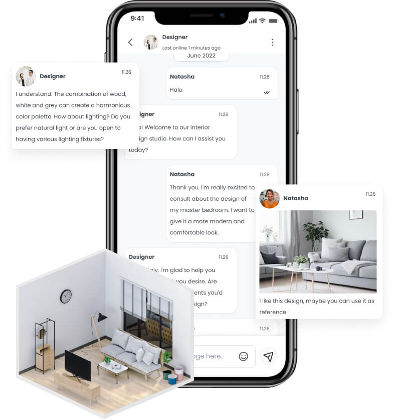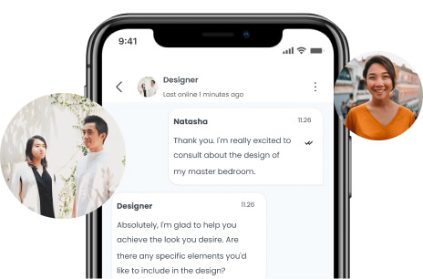 The interior designer that you select before will message with you to collaborate on ideas before sending your initial concepts to rate and review.